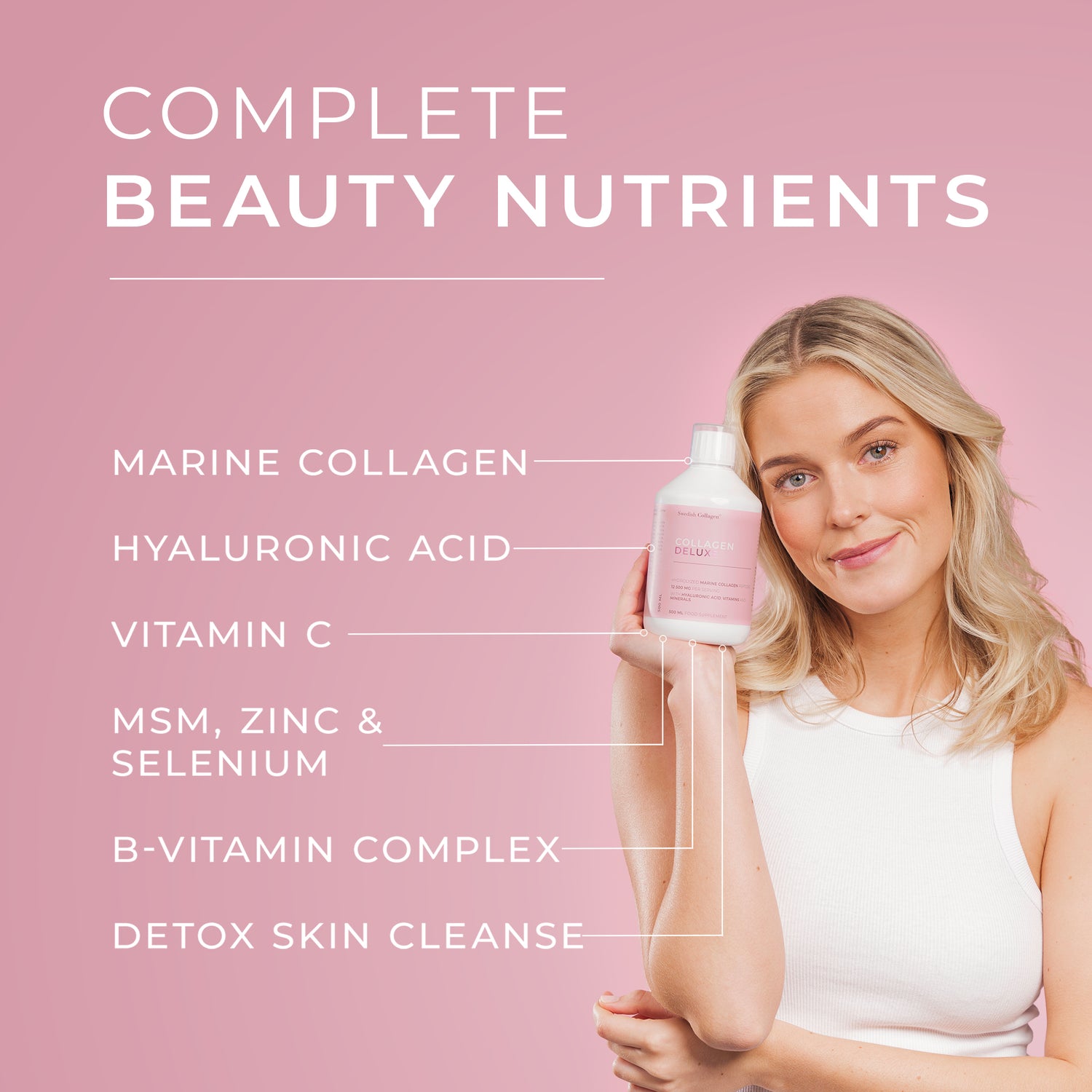One single shot of Swedish Collagen Deluxe contains clinically-proven 12 500 mg of hydrolyzed collagen peptides, with a blend of 14 active ingredients. This formula makes it up to 25 times more concentrated than conventional collagen capsules or pills.