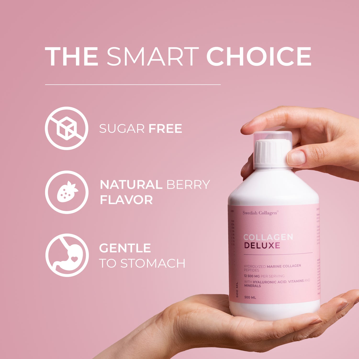 Un solo disparo de Swedish Collagen Deluxe contiene 12.500 mg de péptidos de colágeno hidrolizado clínicamente probados, con una mezcla de 14 ingredientes activos. Esta fórmula lo hace hasta 25 veces más concentrado que las cápsulas o pastillas de colágeno convencionales.