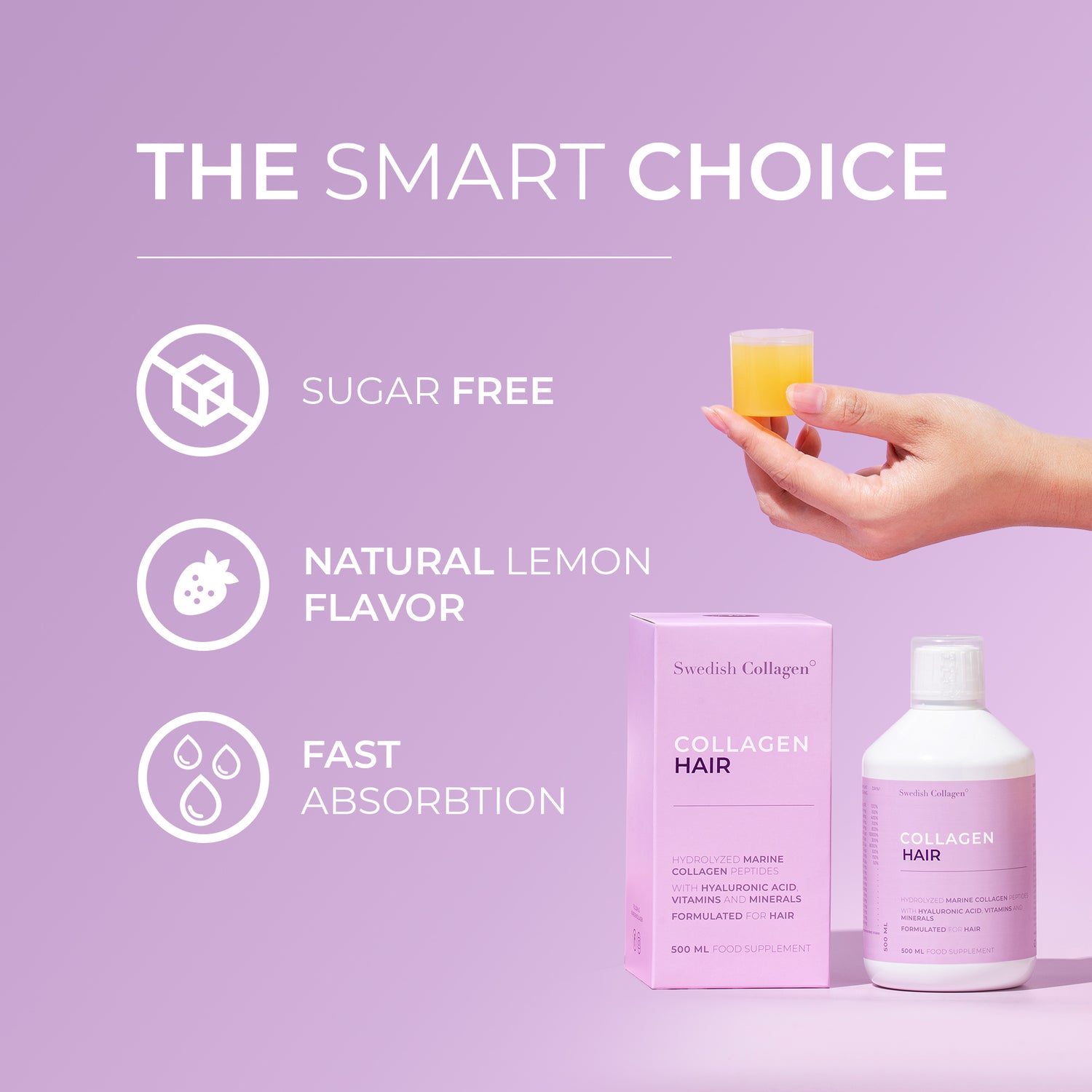 As we age, our body’s natural collagen production slows, leading to visible signs such as wrinkles, thinning hair, and brittle nails. Collagen Hair offers a targeted solution with a daily dose of 2 500 mg hydrolyzed marine collagen and 5 000 µg of biotin—two key nutrients that help maintain firm, healthy skin and support stronger, more vibrant hair.